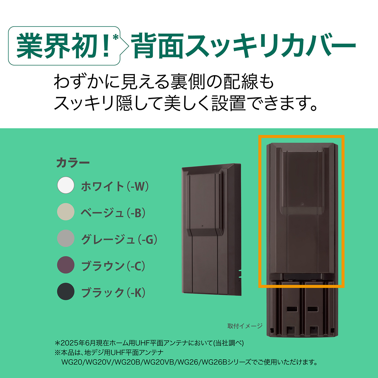 当社のUHF平面アンテナ、WGシリーズ専用の背面スッキリカバー。わずかに見える裏側の配線も、スッキリ隠して美しく設置できます