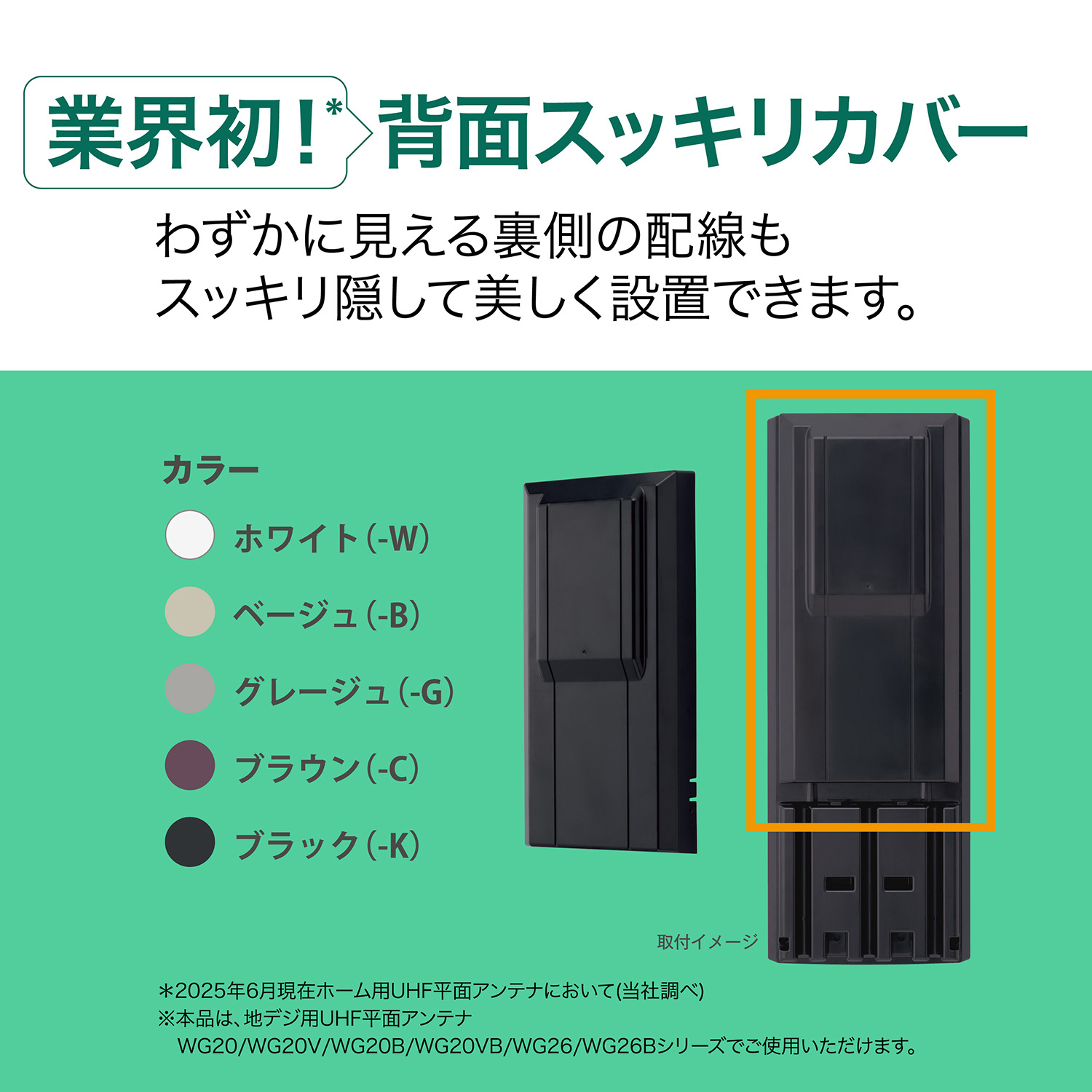 当社のUHF平面アンテナ、WGシリーズ専用の背面スッキリカバー。わずかに見える裏側の配線も、スッキリ隠して美しく設置できます